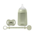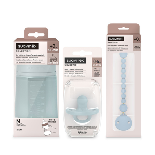 Një set dhuratash nga koleksioni Color Essence, perfekt për të mirëpritur një të porsalindur. Kompleti perfekt që bashkon bukurinë dhe inovacionin. Cuco tërësisht silikoni me koke fiziologjike SX Pro, mosh: 0-6 muaj, ideale për të sapolindurit. Shishe silikoni 240 ml me koke silikoni fiziologjik SX Pro Medium Flow, me valvul kundër dhimbjes së barkut, për bebe +3 muajsh. A e dini se koka SX Pro e këtij biberoni dhe cucoje respekton shëndetin oral të foshnjës?